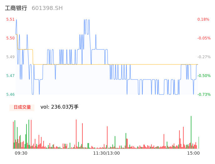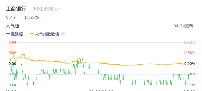 04月24日,工商银行收报5.47,股价涨幅-0.55%,成交金额12.93亿元,换手率0.09%。