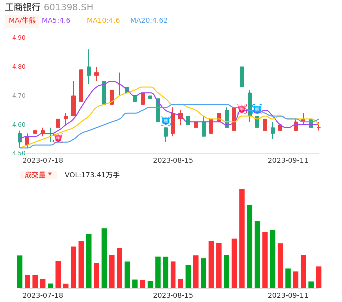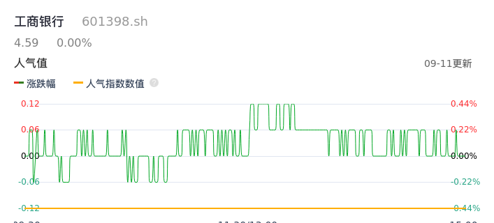 09月11日,工商银行收报4.59,股价涨幅0.00%,成交金额7.97亿元,换手率0.06%。