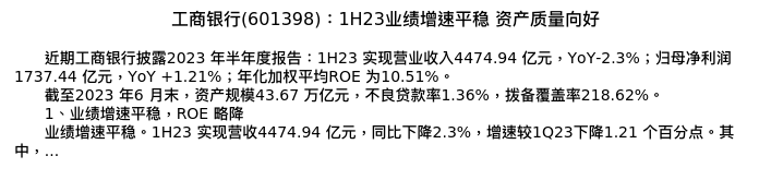 值得注意的是:2023年09月招商证券的邵春雨分析师,首次发布关于工商银行的研究报告,标题为:工商银行(601398):1H23业绩增速平稳 资产质量向好。