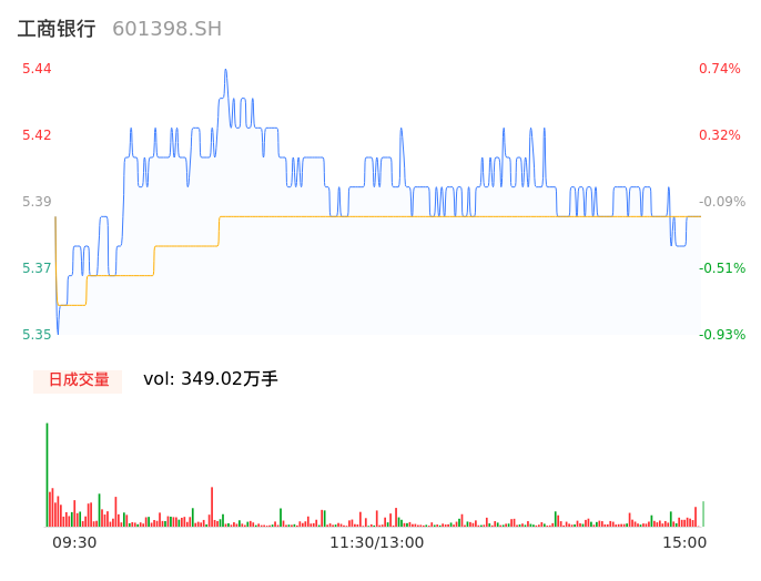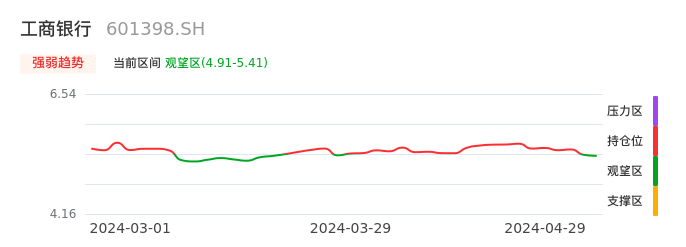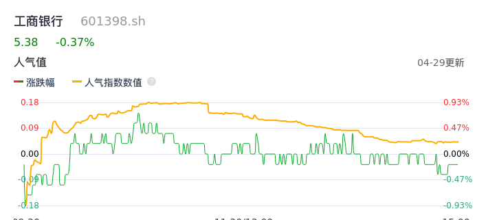 04月29日,工商银行收报5.38,股价涨幅-0.37%,成交金额18.82亿元,换手率0.13%。