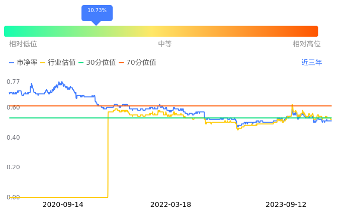 工商银行当前市净率PB为0.51,在所属的国有大型银行中,市净率PB排2,前五名分别为交通银行市净率0.47、工商银行市净率0.51、中国银行市净率0.51、农业银行市净率0.53、建设银行市净率0.54。工商银行当前市净率PB为0.51,超过近3年10.73%的历史数据。