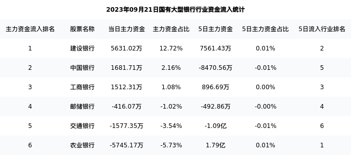 从主力资金流向来看,国有大型银行行业今日主力资金流入27.10亿元,在所有申万二级行业中排名:6/131。