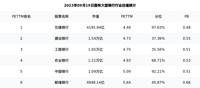 从估值角度看:工商银行最新市盈率PETTM为4.75,在行业内排名3/6,处于35.56分位。