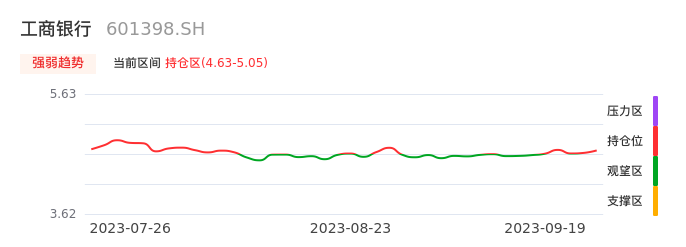 我们来看一下该股的九方特色指标强弱趋势的情况:工商银行自09月13日从观望区上穿到持仓区。股价近期在多头区域持续强势上扬,上升动能仍较为充足,可积极关注。后续重点关注上方压力位:5.05元是否能突破上攻。