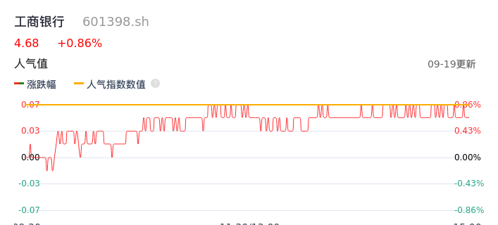 09月19日,工商银行收报4.68,股价涨幅0.86%,成交金额9.64亿元,换手率0.08%。