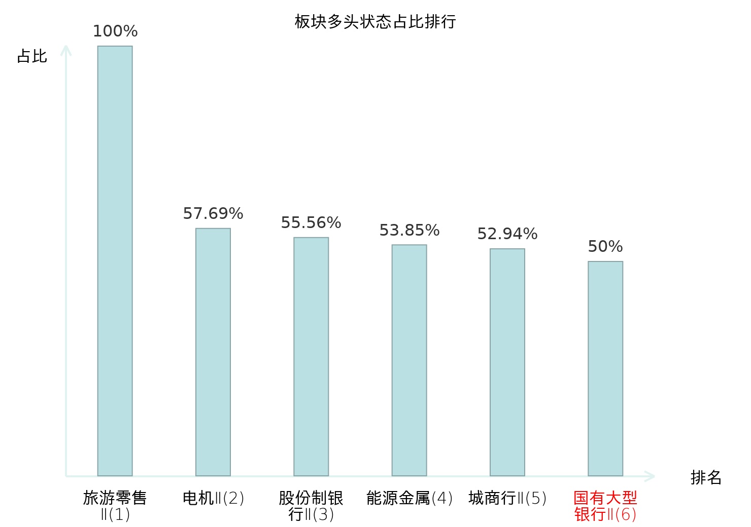 全市场所有行业板块中主力多头状态占比排名中,旅游零售Ⅱ板块位居第一。地面兵装Ⅱ板块名次提升最快,较昨日上升99位。