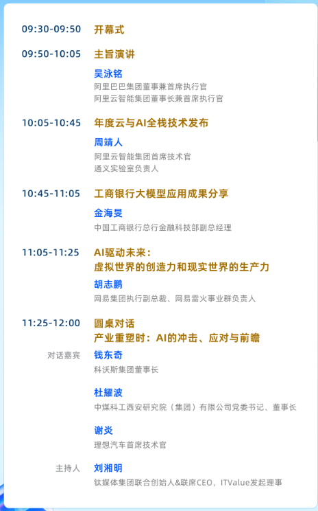 上证报中国证券网讯9月16日,2025云栖大会发布开幕式主论坛议程。议程显示,阿里巴巴集团董事兼首席执行官、阿里云智能集团董事长兼首席执行官吴泳铭将发表主旨演讲;阿里云智能集团首席技术官、通义实验室负责人周靖人将进行年度云与AI全栈技术发布。