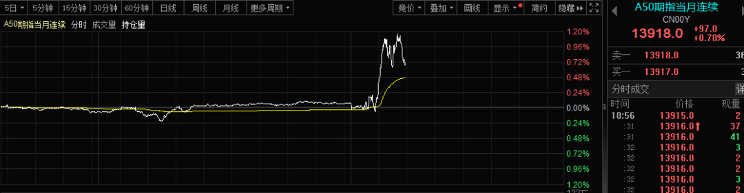 今天上午,A股市场打破前几个交易日的沉寂,开启大幅拉升模式,沪深300指数涨1%,沪指涨0.92%,市场呈现放量格局。更为重要的是,A50期指于早上9点50分之后突然直线拉升,令该指数的技术指标来到多头发散的状态。那么,究竟发生了什么?