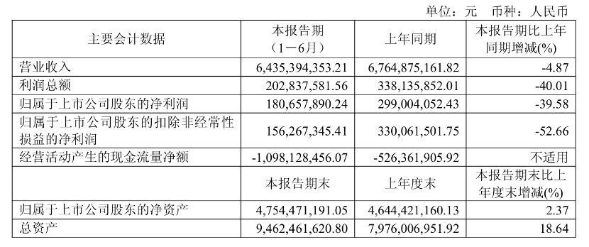 今年第二季度,该公司营业收入34.41亿元,同比下降9.72%;归母净利润9100万元,同比下降59.22%;扣非净利润6768万元,同比下降72.53%。