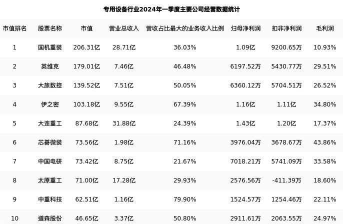 国机重装最新报告期数据为一季度,下表汇总了专用设备行业内市值靠前的公司一季度主要经营数据
