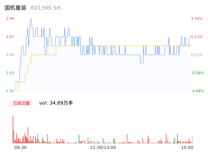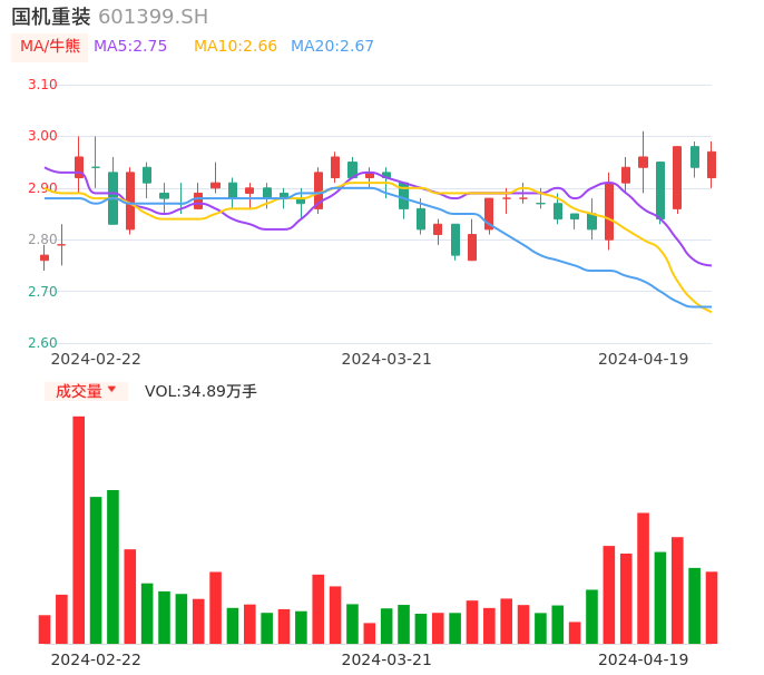 04月19日,国机重装收报2.97,股价涨幅1.02%,成交金额1.03亿元,换手率0.48%。