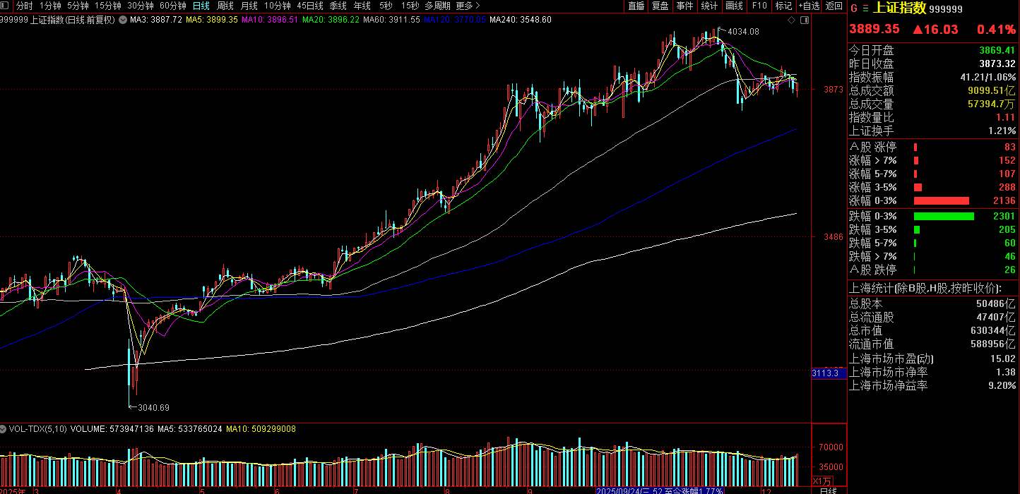 三大指数下探回升,其中沪指涨0.41%,深成指涨0.84%,创业板指涨0.97%。总体个股涨跌相当,上涨家数为2683家,涨停家数(排除ST)为77家,跌停家数(排除ST)为14家,市场情绪迎来修复。两市成交额总计2.09万亿,较昨日放量2351亿,成交量再度站上2万亿