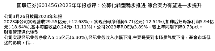 值得注意的是:2024年04月中航证券的薄晓旭/师梦泽分析师,首次发布关于国联证券的研究报告,标题为:国联证券(601456)2023年年报点评:公募化转型稳步推进 综合实力有望进一步提升。