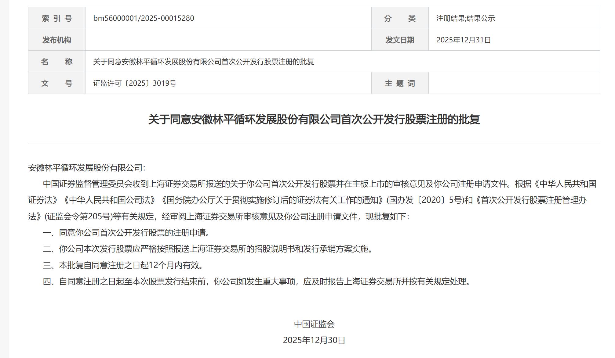 智通财经APP获悉,12月31日,中国证监会发布《关于同意安徽林平循环发展股份有限公司首次公开发行股票注册的批复》。据悉,林平发展拟在上交所主板上市,国联民生证券为其保荐机构,拟募资12亿元。