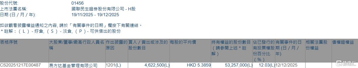 国联民生(01456.HK)遭易方达基金减持462.25万股