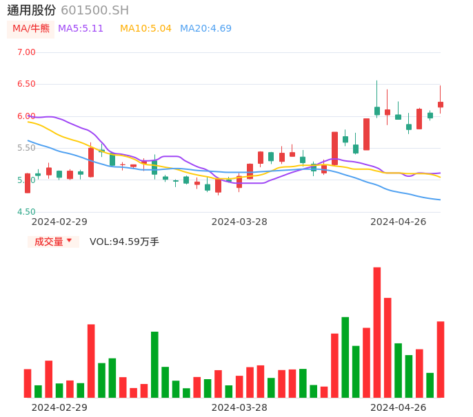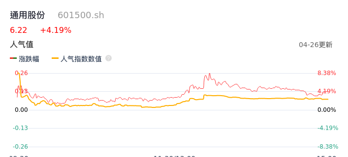 04月26日,通用股份收报6.22,股价涨幅4.19%,成交金额5.87亿元,换手率6.03%。