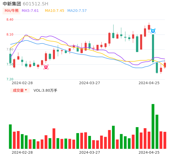 04月25日,中新集团收报7.53,股价涨幅1.35%,成交金额2862.14万元,换手率0.25%。