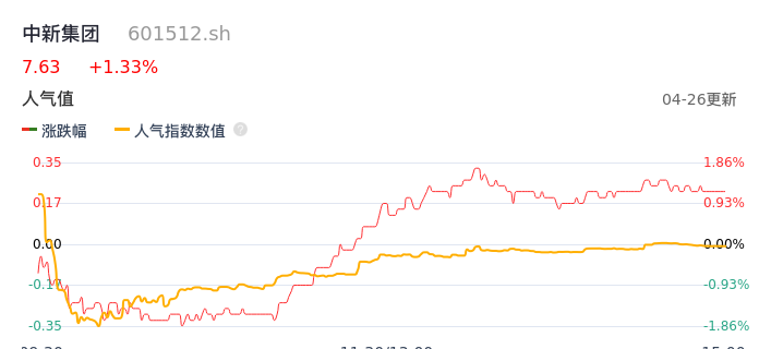 04月26日,中新集团收报7.63,股价涨幅1.33%,成交金额4080.59万元,换手率0.36%。
