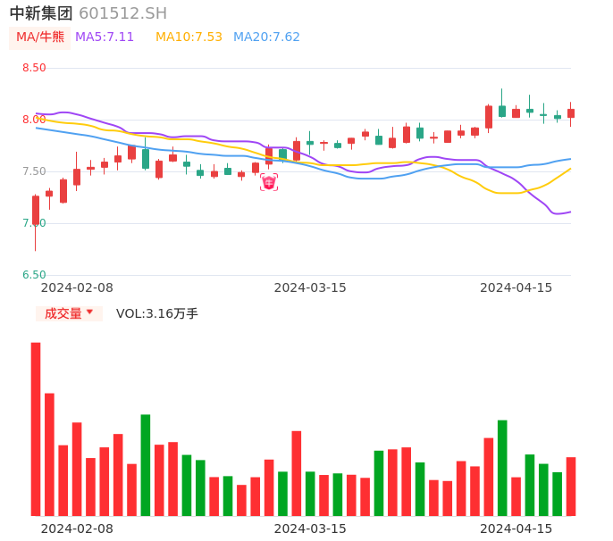 04月15日,中新集团收报8.10,股价涨幅1.12%,成交金额2552.00万元,换手率0.21%。
