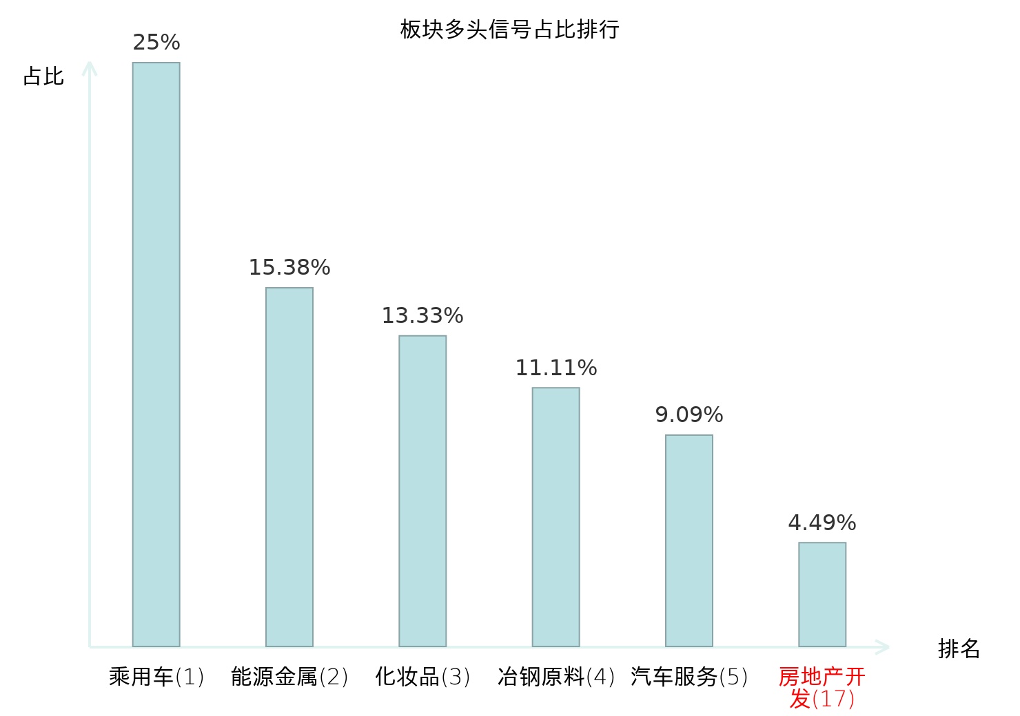 全市场所有行业板块中主力多头信号占比排名中,乘用车板块位居第一。能源金属板块名次提升最快,较昨日上升110位。