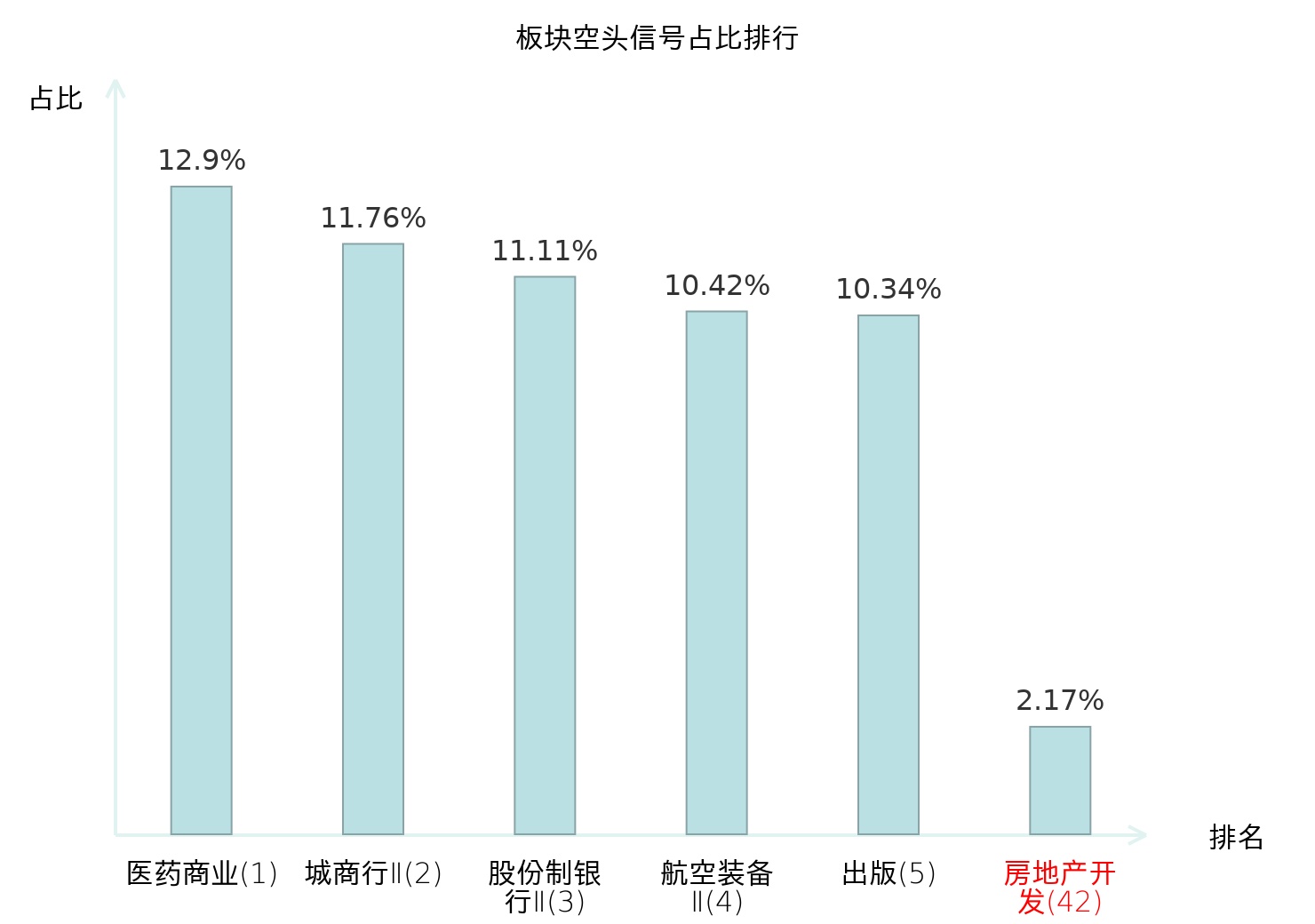 全市场所有行业板块中主力空头信号占比排名中,医药商业板块位居第一。城商行Ⅱ板块名次提升最快,较昨日上升102位。