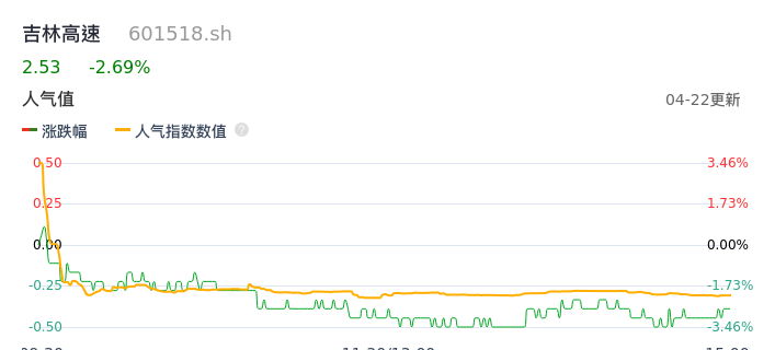 04月22日,吉林高速收报2.53,股价涨幅-2.69%,成交金额1.18亿元,换手率2.45%。