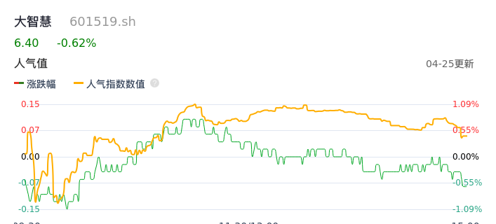 04月25日,大智慧收报6.40,股价涨幅-0.62%,成交金额8881.34万元,换手率0.69%。