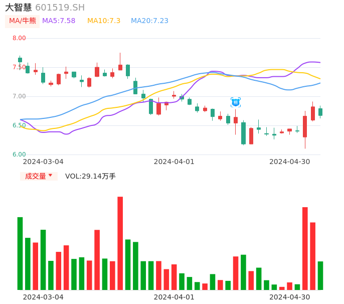 04月30日,大智慧收报6.67,股价涨幅-2.20%,成交金额1.96亿元,换手率1.45%。