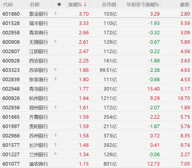 A股银行股集体上涨,紫金银行、瑞丰银行涨超3%