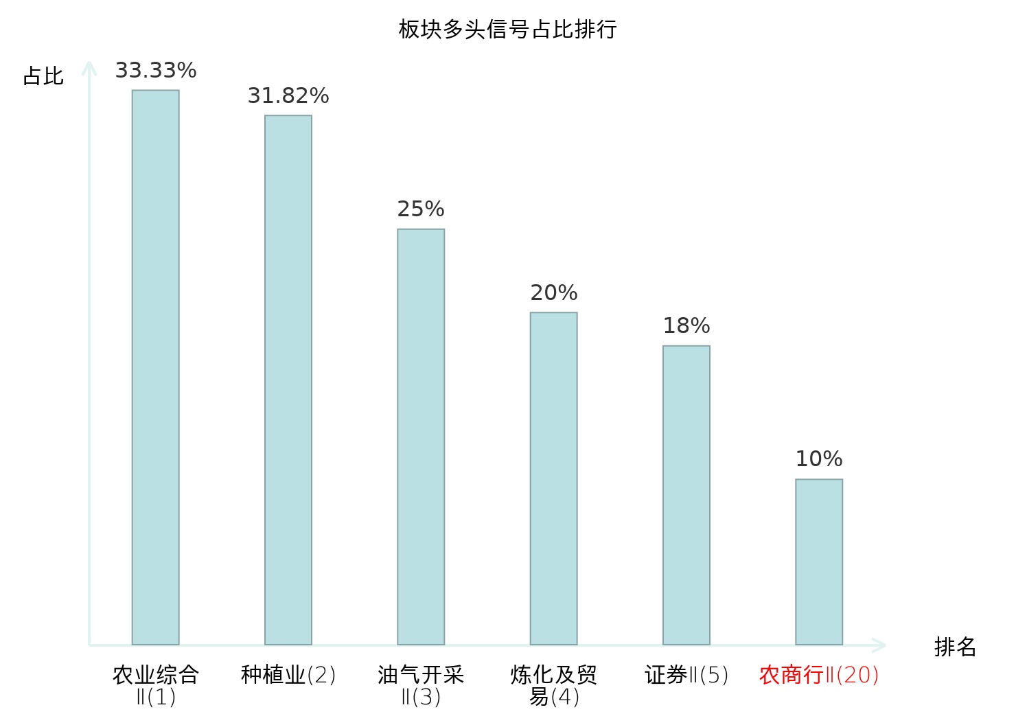 全市场所有行业板块中主力多头信号占比排名中,农业综合Ⅱ板块位居第一。农业综合Ⅱ板块名次提升最快,较昨日上升127位。