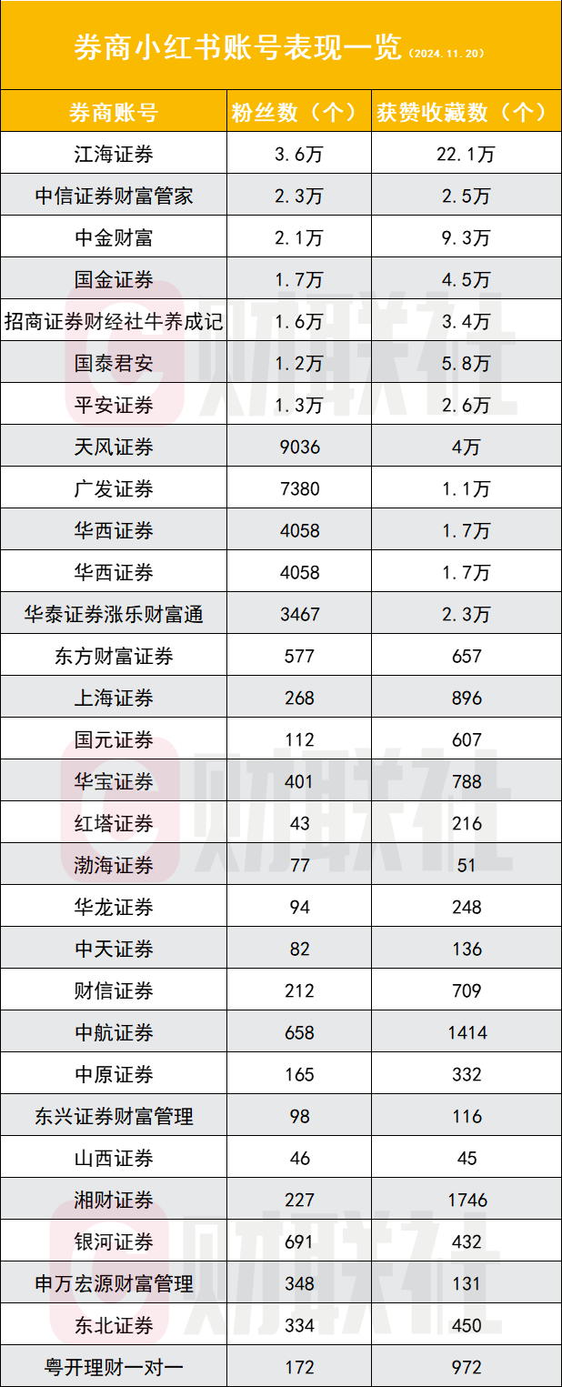 33家入驻小红书的券商为包括中信证券、国金证券、国泰君安、平安证券、银河证券、广发证券、中金财富、江海证券、东方财富证券、招商证券、天风证券、华西证券、上海证券、国元证券、华宝证券、红塔证券、渤海证券、华龙证券、中天证券、财信证券、中航证券、海通证券、东方证券、中信建投证券、华泰证券、中原证券、世纪证券、华鑫证券、华西证券、东兴证券、山西证券、东北证券、湘财证券以及申万宏源证券等。
