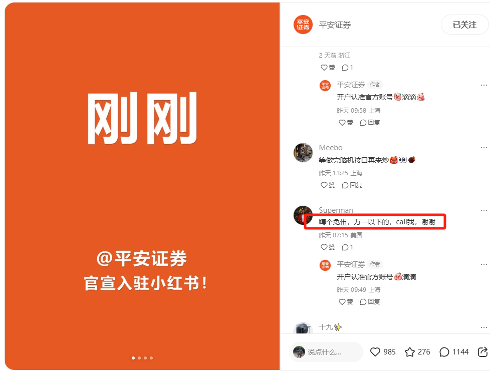 券商入驻小红书,首先是展业,通过公域流量的运营,开拓更多的股票账户、两融账户以及提供理财服务等;其次是提升品牌影响力以及投教。从投资者与券商评论回复内容来看,低佣金费率仍是第一需求,在券商官宣入驻小红书的评论区,往往集聚了众多关于证券交易费率的评论。