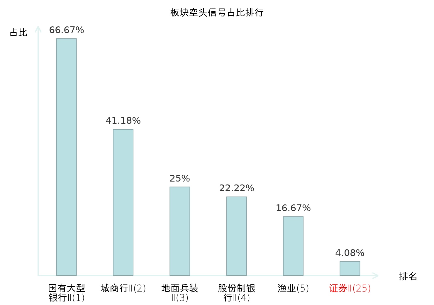 全市场所有行业板块中主力空头信号占比排名中,国有大型银行Ⅱ板块位居第一。小金属板块名次提升最快,较昨日上升117位。