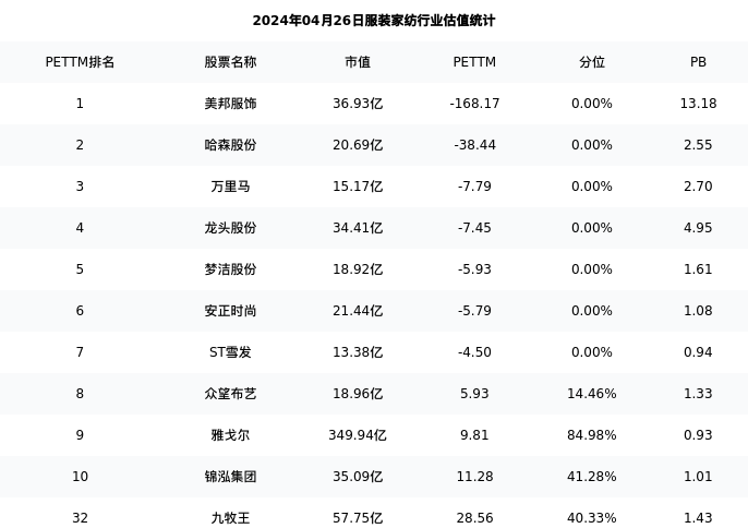 从估值角度看:九牧王最新市盈率PETTM为28.56,在行业内排名25/56,处于40.33分位。