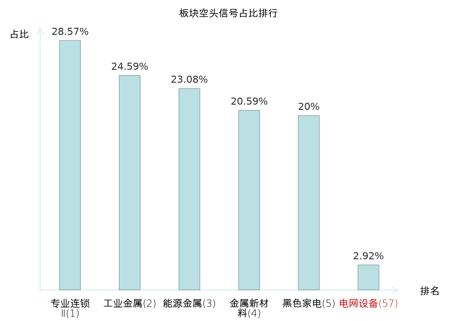 全市场所有行业板块中主力空头信号占比排名中,专业连锁Ⅱ板块位居第一。装修建材板块名次提升最快,较昨日上升120位。