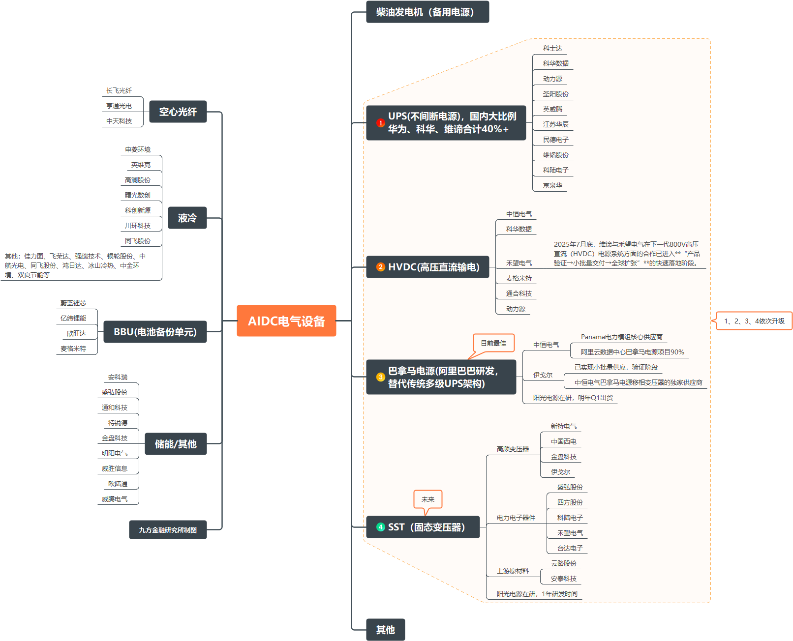 HVDC/SST:HVDC相较于UPS具有更高的转换效率、更小的占地面积等充分契合AIDC时代下的需求特征。未来SST有望成为AIDC输配电的重要路径,其相较于HVDC具有更高的转换效率和更小的占地面积。
