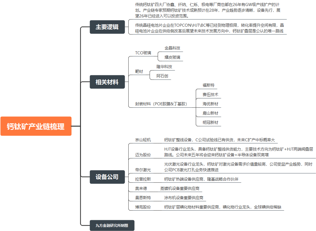 从产业链角度,钙钛矿组件封装环节重要性较晶硅进一步提升,带来POE粒子胶膜产业链、导电玻璃产业链、ITO等靶材产业链的变化与机遇;此外,钙钛矿电池制备流程有别于晶硅电池,带来涂布设备、PVD设备、激光设备等增量设备需求。
