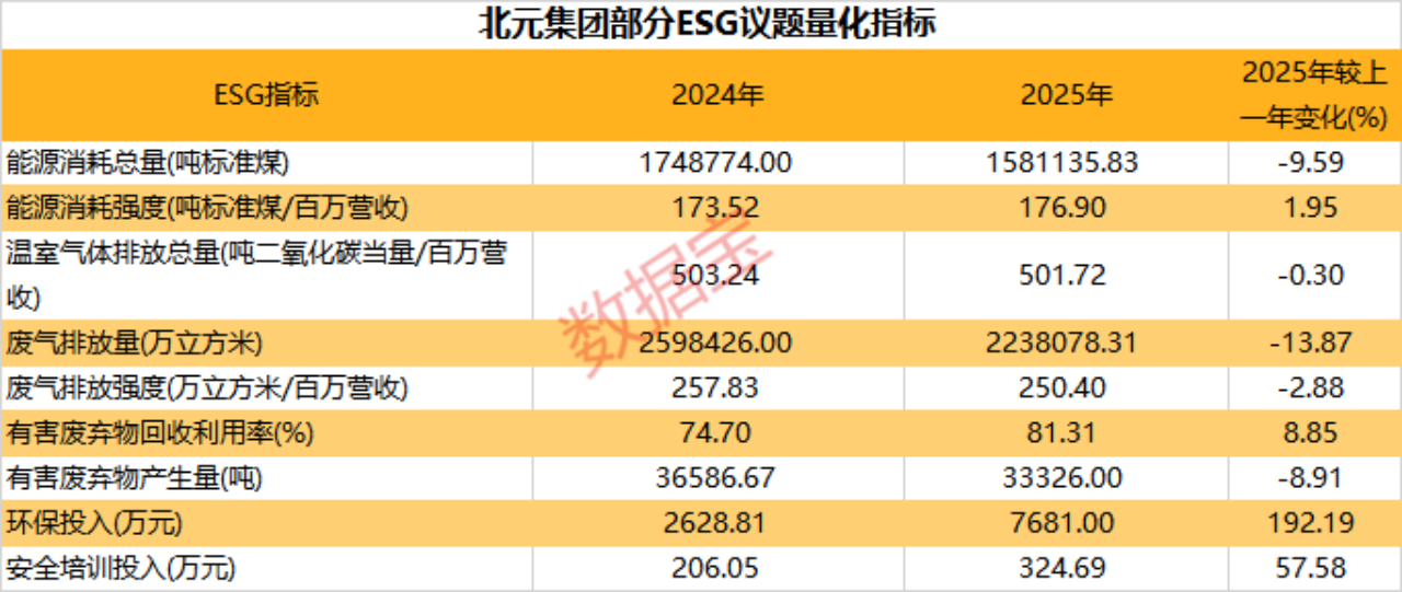 报告期内,公司为深入推进绿色低碳转型,公司建成了首个300MW集中式光伏发电项目。从总量来看,2025年,北元集团环保投入7681万元,较上一年增加近2倍;能源总消耗量、废弃排放量、有害废弃物产生量等环境议题较上一年均有下降。其中,能源总消耗量下降近10%,废弃排放量下降近14%。
