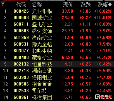 黄金概念股上涨,兴业银锡、国成矿业涨停,盛达资源、海南矿业等涨超7%.