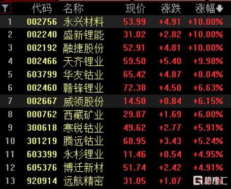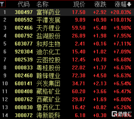 盘面上,碳酸锂期货价格持续上涨,锂矿概念、锂电池产业链大爆发,天齐锂业、盛新锂业、雅化集团等多股涨停;黄金概念板块继续上升,兴业银锡、国成矿业涨停;油气、银行等少数几个板块录得下跌。