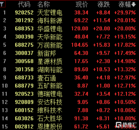 能源金属板块暴涨,永兴材料、天齐锂业、盛新锂能、融捷股份涨停。