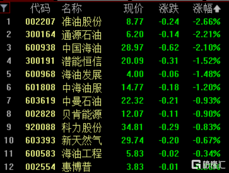 油气开采及服务板块走低,淮油股份、通源石油、中国海油跌超2%,潜能恒信、海油发展、中海油服跌超1%。