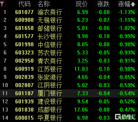 银行板块下跌,渝农银行、无锡银行、邮储银行跌超1%,长沙银行、中信银行跌近1%。