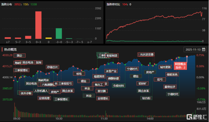 11月13日,A股三大指数今日低开高走,截至收盘,沪指涨0.73%报4029点续创十年新高,深证成指涨1.78%,创业板指涨2.55%,北证50指数涨2.62%。全市场成交额2.07万亿元,较前一交易日增量1009亿元,超3900股上涨,逾百股涨停。