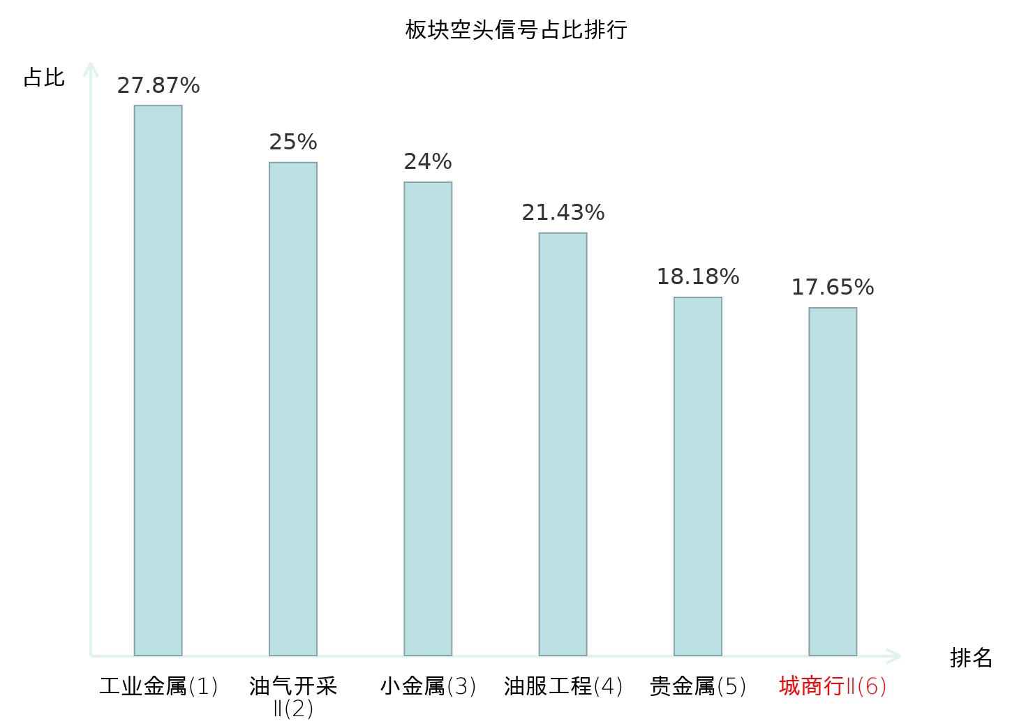 全市场所有行业板块中主力空头信号占比排名中,工业金属板块位居第一。饲料板块名次提升最快,较昨日上升112位。