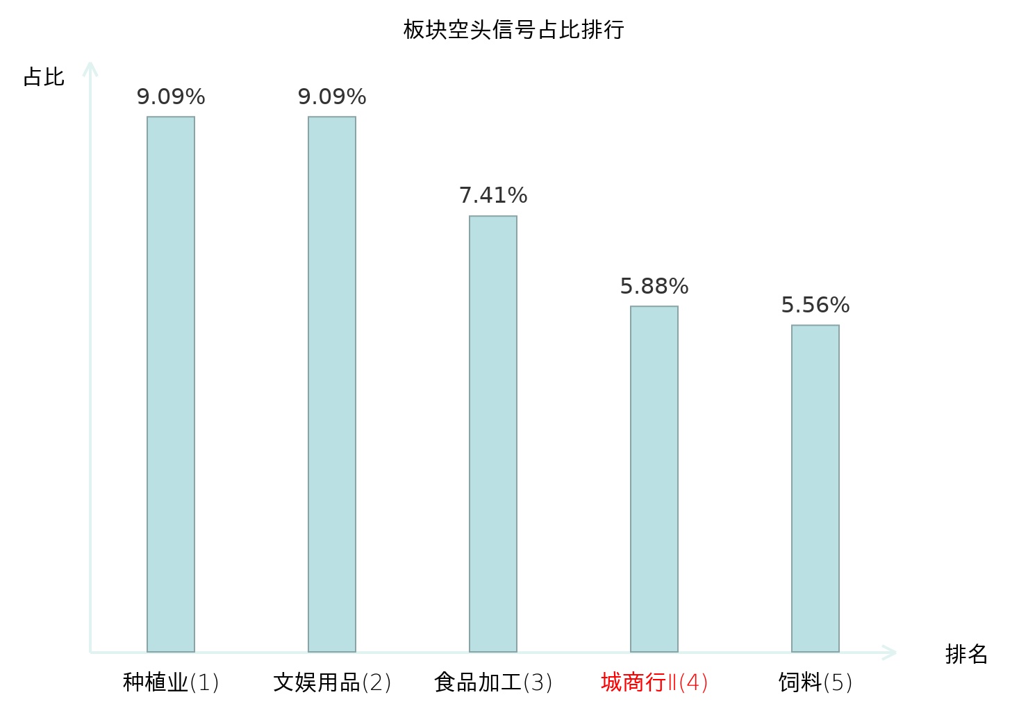 全市场所有行业板块中主力空头信号占比排名中,种植业板块位居第一。文娱用品板块名次提升最快,较昨日上升112位。