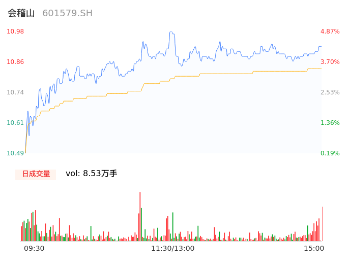 04月22日,会稽山收报10.93,股价涨幅4.39%,成交金额9238.34万元,换手率1.78%。