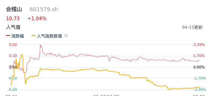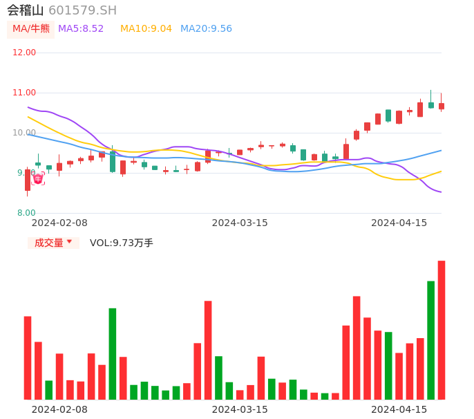 04月15日,会稽山收报10.73,股价涨幅1.04%,成交金额1.04亿元,换手率2.03%。