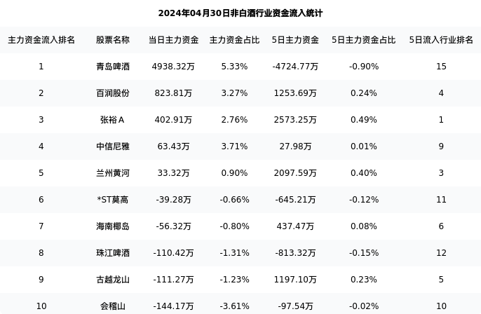 从主力资金流向来看,非白酒行业今日主力资金流入9.20亿元,在所有申万二级行业中排名:79/131。