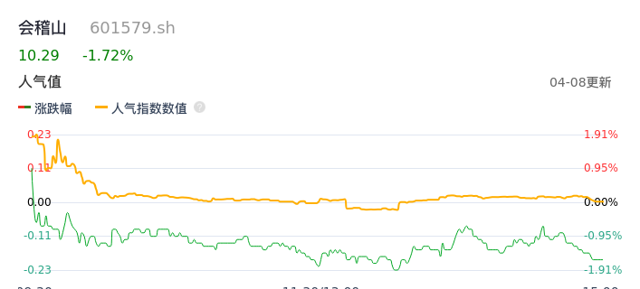 04月08日,会稽山收报10.29,股价涨幅-1.72%,成交金额5969.04万元,换手率1.20%。